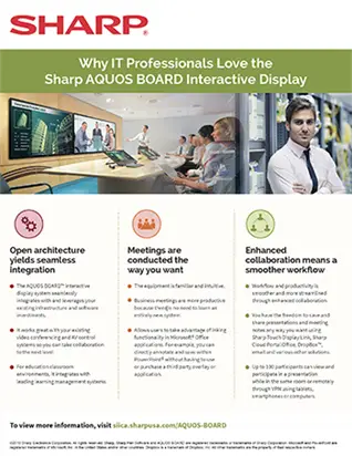 Sharp AQUOS BOARD® interactive display systems are much more than your typical interactive white boards. Designed for smooth and effortless communication in a wide range of contexts, their highly responsive touch pens allow several people to write on the same touch screen at the same time. And the built-in screen sharing application enables multifaceted wireless communication. Whether in the office boardroom or the classroom, Sharp changes the way you communicate.