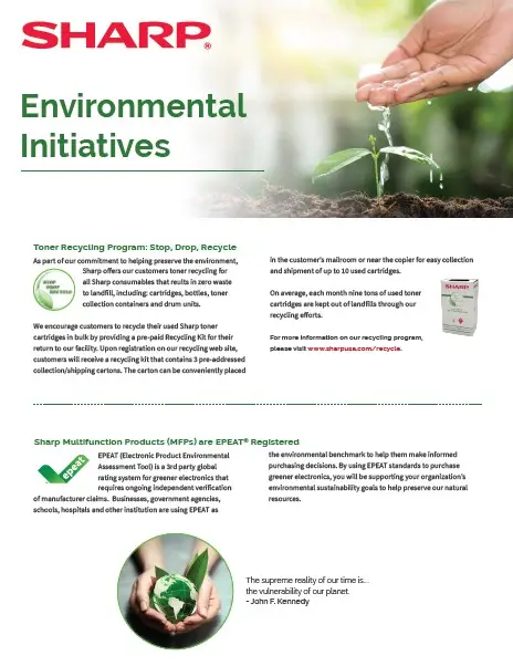 Sharp’s dedication to environmental stewardship is a long standing corporate core value that’s demonstrated in our products and our business activities, not a response to the latest trends.