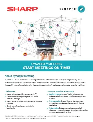 Synappx Meeting helps you start meetings on time, keeping your focus on collaboration and sharing ideas.  Swiftly connect your personal device to a big screen, start the web conferencing system and have content at the ready – all with just one click of a button.